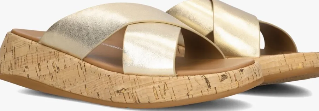 Damesslipper model FT7 in het goudkleurig van FitFlop. Deze goudkleurige teenslipper voor dames van het merk FitFlop. Deze teenslipper is uitgevoerd met een gekruiste brede lederen band. De binnenvoering is van leer, het voetbed is van rubber. De zool meet circa 4,5 cm en is uitgevoerd in kurk look. Verder heeft de rubberen loopzool een fijn profiel.
