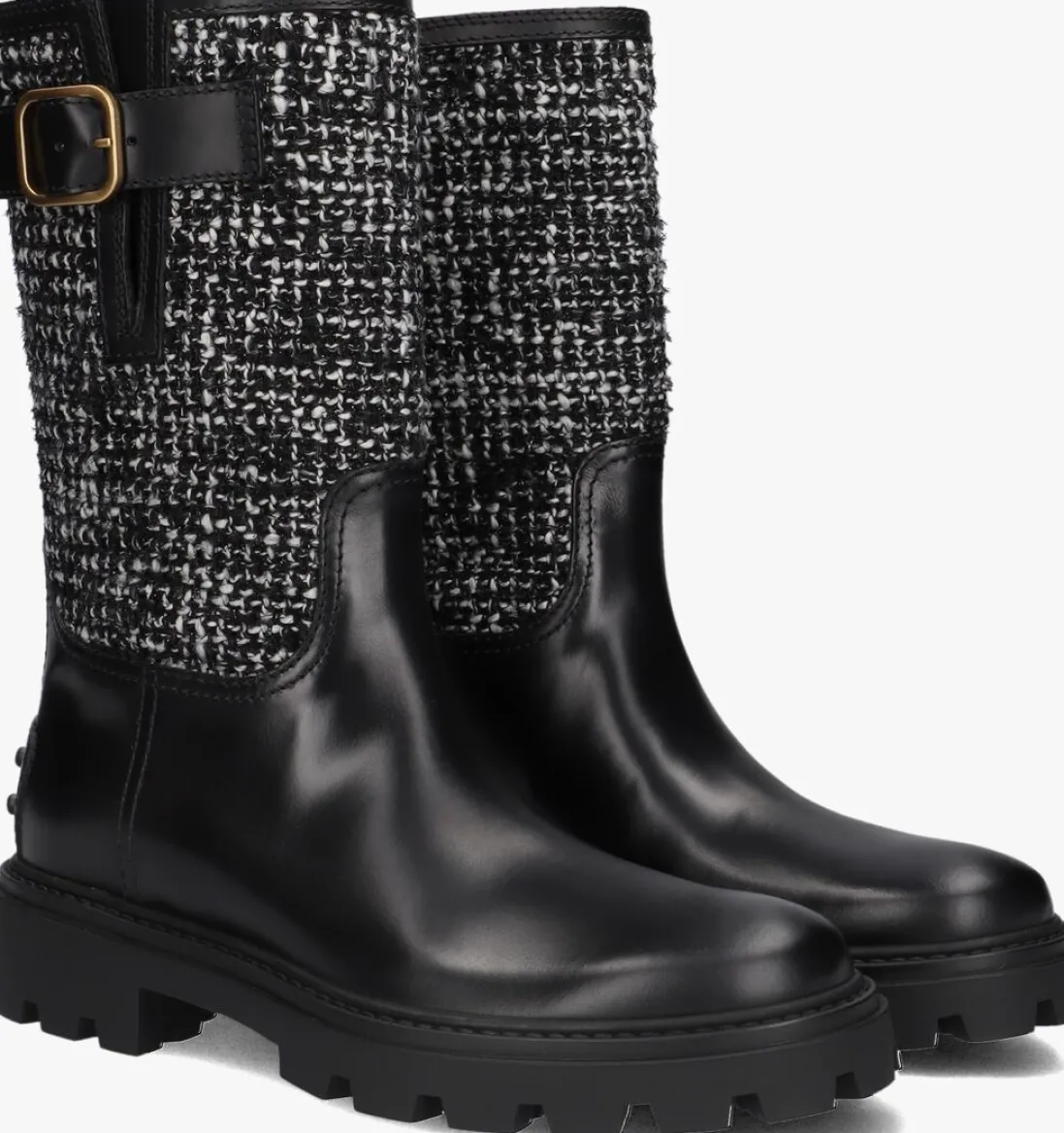 Laars met tweed voor dames van het merk TOD’S. Deze enkellaars met ronde neus is uitgevoerd in zwart leer en zwart witte tweed stof. De buitenzijde van de schacht bevat een goudkleurige gesp. De schacht van de laars loopt recht en heeft geen rits. De binnenzijde is uitgevoerd in leer en een stevig contrefort draagt bij aan het loopgemak. De rubberen loopzool heeft een grof profiel voor stevige grip.